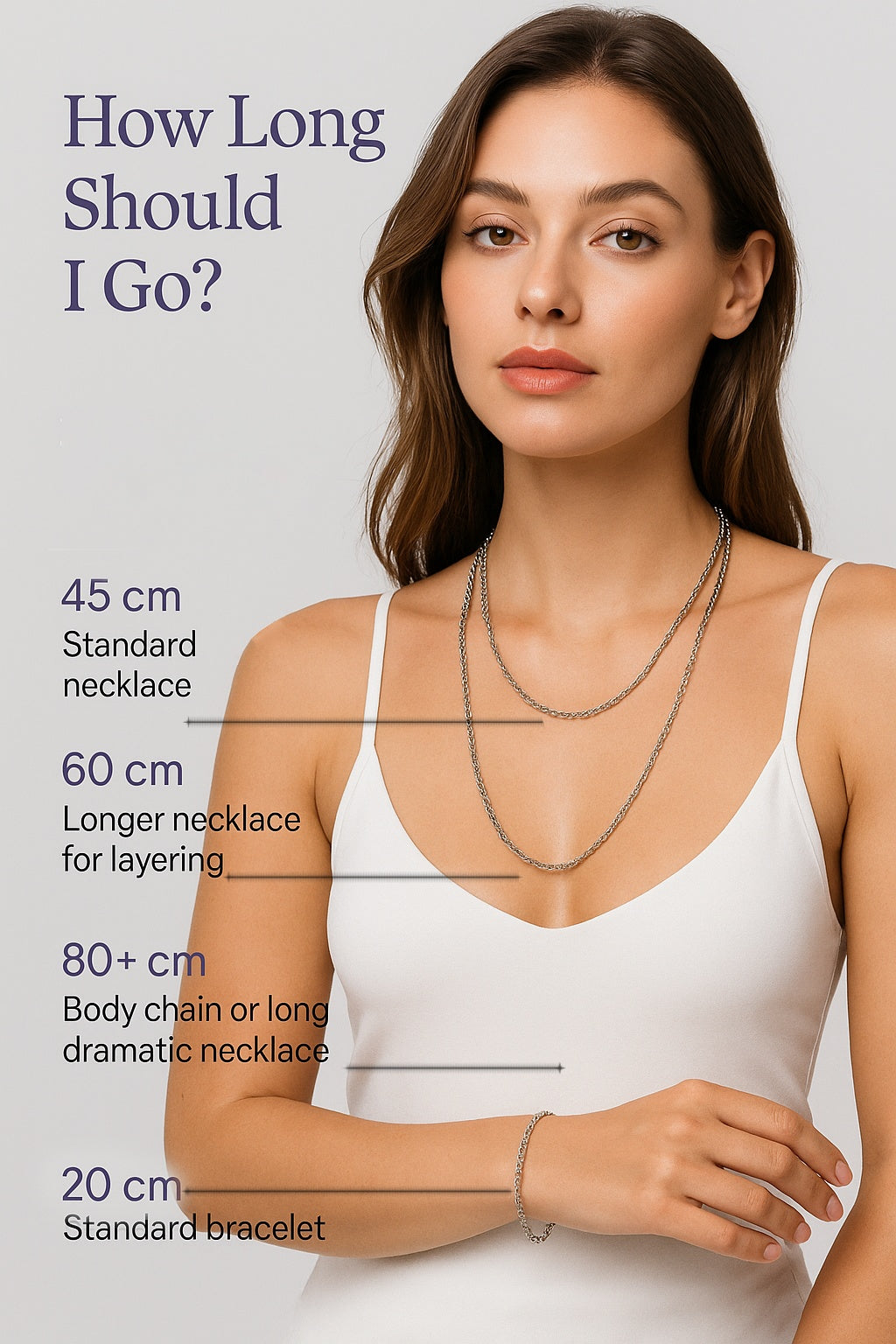 This image provides a general reference for how each necklace size might appear. Measurements are given in centimeters.