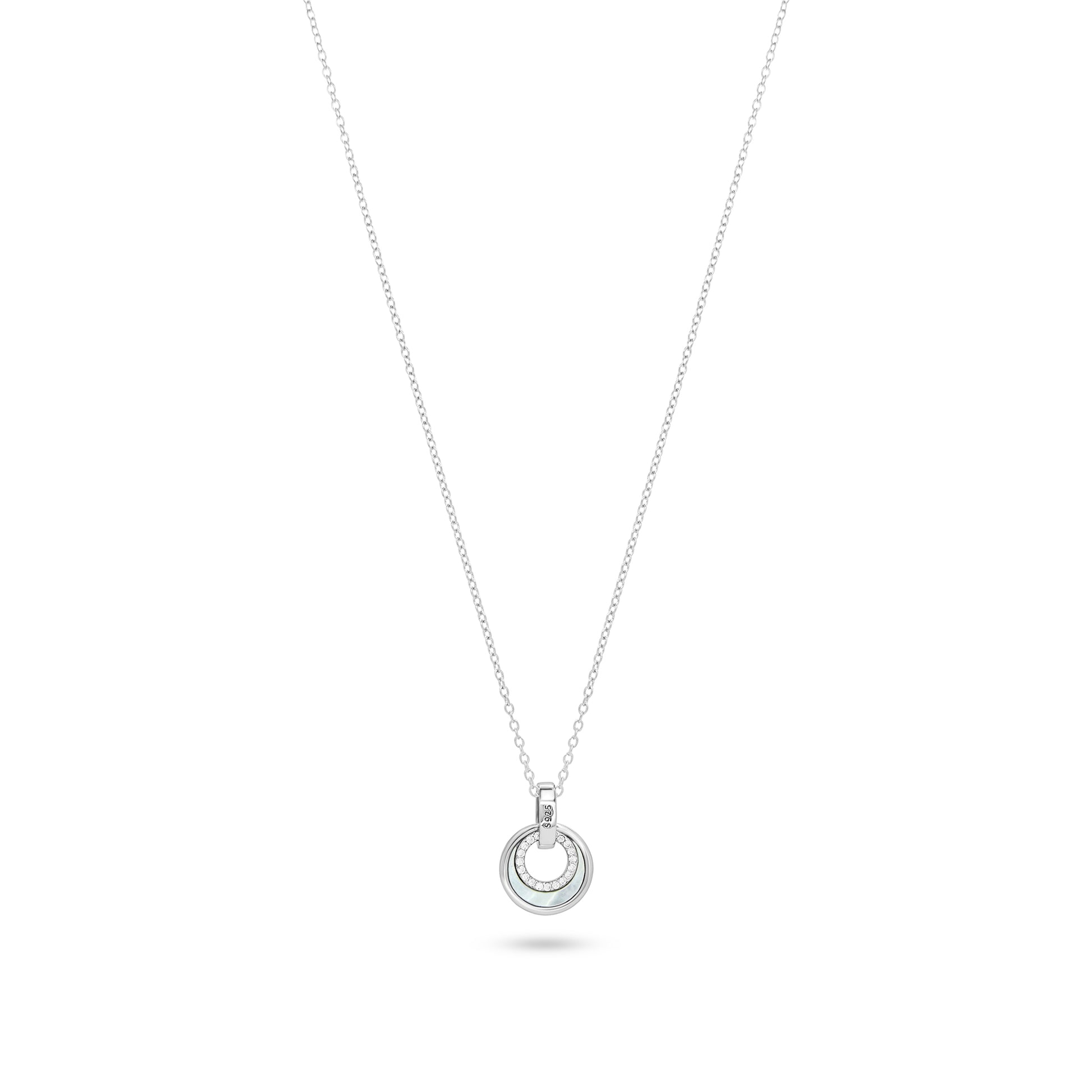 A sterling silver necklace with interlocking circles, one of which is adorned with baguette-cut zircon stones.