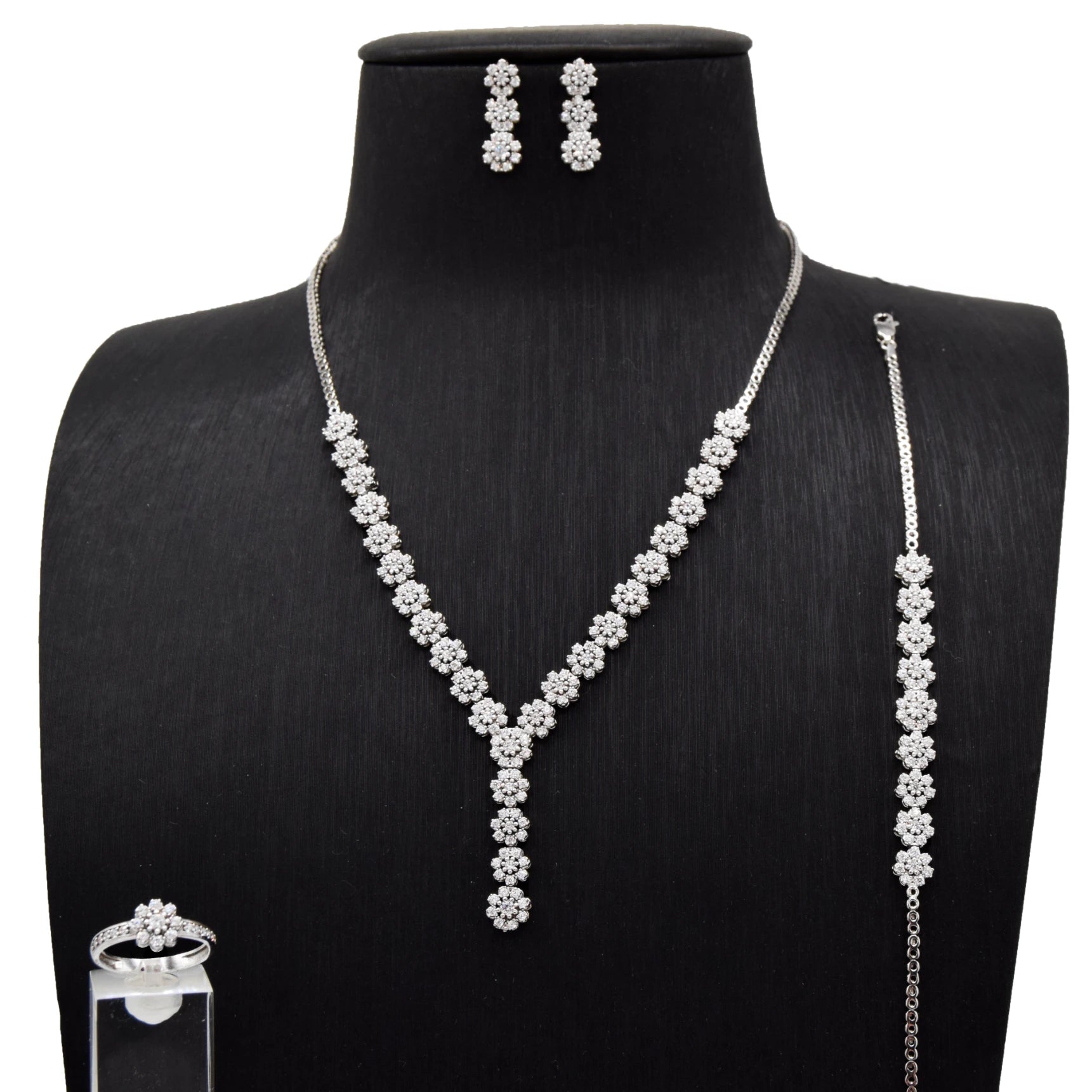 This stunning sterling silver necklace and earring set features sparkling zircon stones arranged in a delicate floral design, perfect for adding a touch of elegance to any outfit. Celebrate your style with this timeless accessory that shines with every movement.