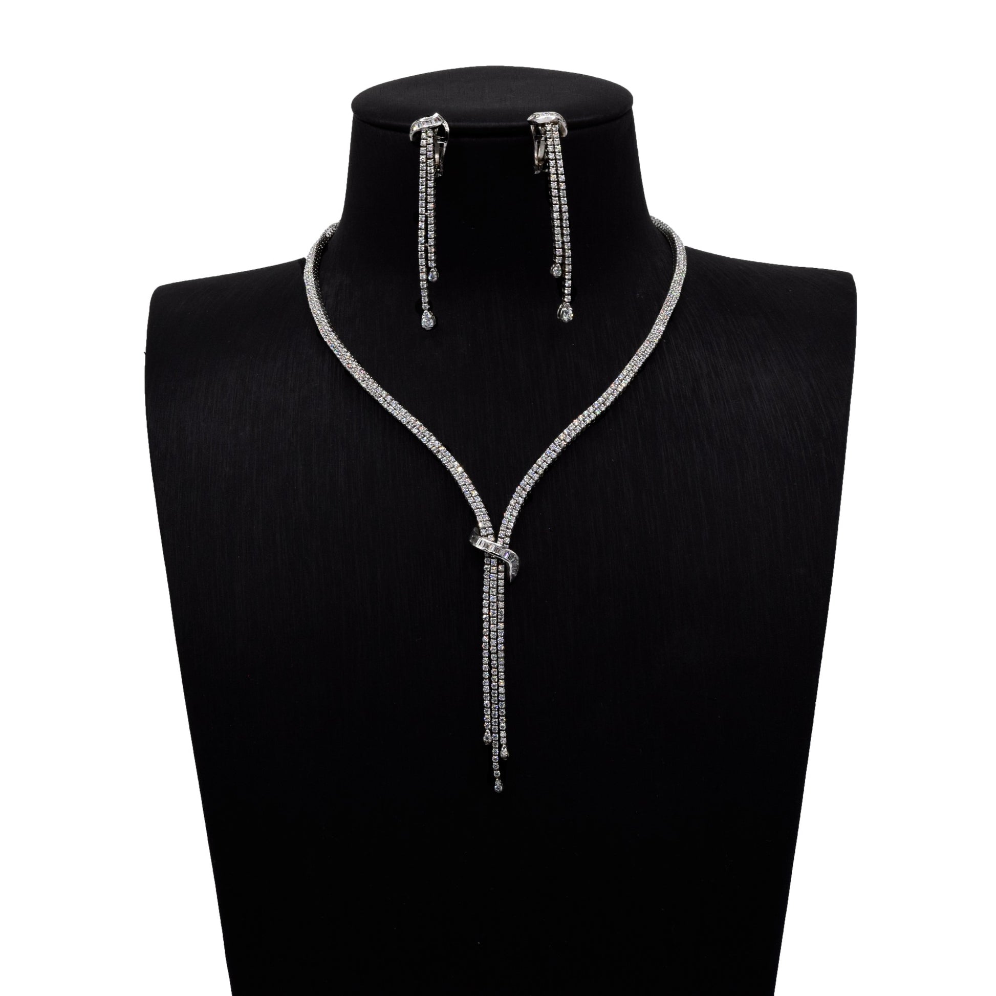 Minimalist with a twist. The Twilight Knot Set brings modern sophistication to life with its clean lines and elegant silhouette. Featuring a graceful Y-shaped drop with a subtle knotted centerpiece, this zircon-studded necklace and matching earrings are made for women who embrace understated glam. Light-catching, fluid, and effortlessly refined, it's your go-to for elegant evenings and elevated events.