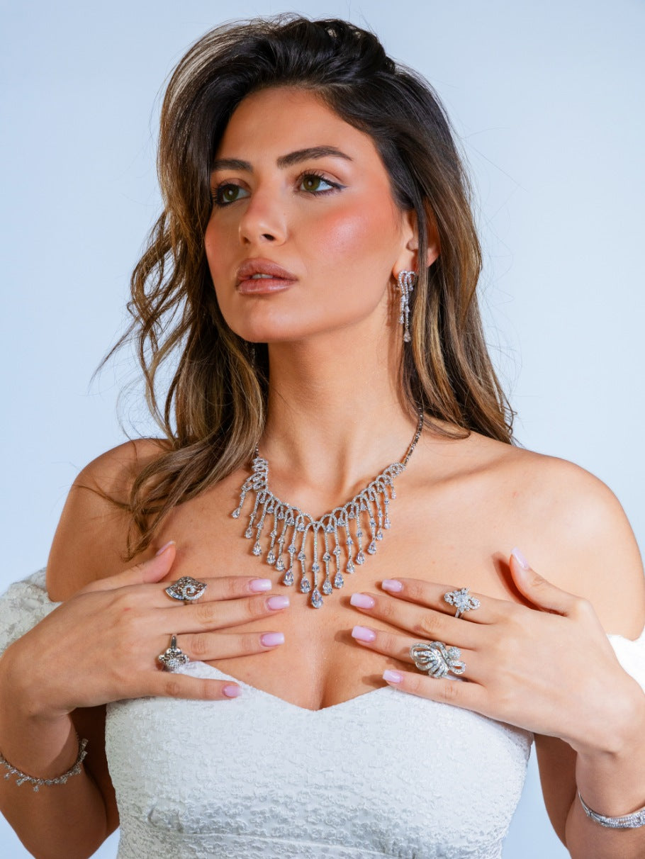 The Crystal Cascade Evening Set is a celebration of refined glamour. Featuring a statement necklace with arching curves and dangling teardrop zircon stones, this set mimics the beauty of falling water in motion.